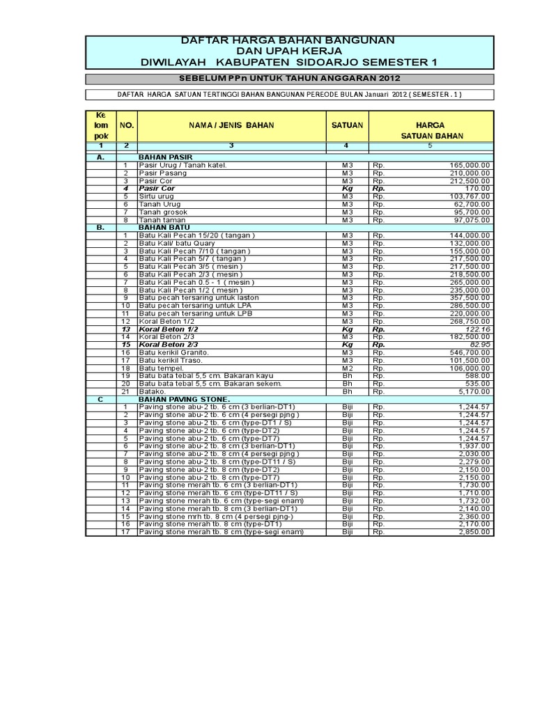 Analisa Harga Satuan Pekerjaan Tugas 2018 Palembang from imgv2-1-f.scribdassets.com Daftar harga bahan bangunan yang saya tulis dalam blog ini sifatnya sebagai info dan acuan untuk membantu membuat anggaran atau estimasi dalam membangun dan merenovasi rumah. Daftar harga bahan bangunan cat tembok a. This page contains information about harga bahan bangunan 2012 at jasa pemborong, mandor, tukang, bangunan, kontraktor, di solo sragen karanganyar blog. Pembahasan tentang materi menyusun anggaran) disitu sudah dijelaskan secara teliti bagaimana dan apa yang harus anda lakukan. Interior dulux pearl glo (2,5 lt ) rp. Pasir mondu (per m3) rp. Agustus 22, 2012 by mandorayub. Harga material bangunan 2012 versi ud cokro joyo.