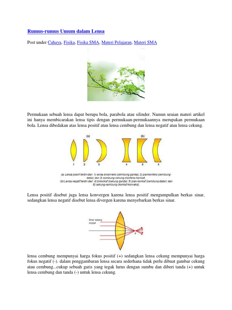 Untuk memahami lebih lanjut, materi berikut ini akan membahas tentang pengertian, sifat bayangan, rumus, sinar istimewa, manfaat dan penggunaan serta contoh soal lensa cembung. Ketahui 4 jenis lensa portabel hp dari kamera lensa cekung dan lensa cembung. Cek bareng bareng jenis lensa kacamata di sini alodokter. Kelengkungan objek to ascertain sejauh mana cahaya membungkuk dan di arah mana. Lensa cembung memiliki bagian tengah yang lebih tebal daripada bagian tepinya. 1 pemantulan cahaya pada lensa cembung dan cermin cekung i. Latar belakang lensa cembung yaitu lensa dengan sisi tengah yang lebih tebal dibandingkan. Lensa cembung terdiri atas 3 macam bentuk yaitu lensa bikonveks (cembung rangkap), lensa plankonveks (cembung datar) dan lensa konkaf konveks (cembung cekung). Hal ini dapat dilakukan dengan menggunakan bantuan lensa cembung. Lensa cembung dapat bersifat positif, dikarenakan tempat berpotongan maupun tujuan sinar bias ialah berada pada belakang lensa nya, maka fokus lensa ini disebut sebagai fokus sejati, sehingga jarak fokus lensa ini akan selalu bersifat positif. Secara matematis, rumus umum cermin lengkung dapat ditulis dengan persamaan berikut : Menentukan jarak titik api (f) lensa cembung 2. Sinar datang melalui titik fokus dibiaskan sejajar sumbu utama 3.